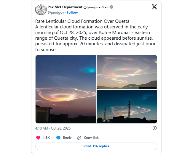 পাকিস্তানের বেলুচিস্তান প্রদেশের রাজধানী কোয়েটার আকাশে মঙ্গলবার ভোরে দেখা গেছে এক বিরল প্রাকৃতিক দৃশ্য‘লেনটিকুলার ক্লাউড’ বা লেন্স আকৃতির মেঘ। আকাশজুড়ে রঙিন ও ঢেউখেলানো এই মেঘ প্রায় ২০ মিনিট স্থায়ী ছিল বলে জানিয়েছে পাকিস্তান আবহাওয়া অধিদপ্তর (পিএমডি)।