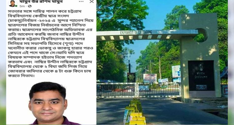 মঙ্গলবার দুপুরে নিজের ফেসবুক পেজে দেওয়া ওই স্ট্যাটাসে মামুন লেখেন, সততার সঙ্গে দায়িত্ব পালন করে চট্টগ্রাম বিশ্ববিদ্যালয় কেন্দ্রীয় ছাত্র সংসদ (চাকসু) নির্বাচন ২০২৫-এ সুন্দর প্যানেল দিয়ে ছাত্রদলের বিজয় নিশ্চিত করায় ছাত্রদলের সাংগঠনিক অভিভাবকের প্রতি আবেদন করছি—জনাব নাছির উদ্দীন নাছিরকে চট্টগ্রাম বিশ্ববিদ্যালয় ছাত্রদলের সিনিয়র সহসভাপতি হিসেবে শূন্য পদে মনোনীত করা হোক। ডাকসু ও জাকসুতে হারার পরও কেমন করে এই পদে থাকেন তিনি! আমি যদি ছাত্রবিষয়ক সম্পাদক হতাম, নিজে পদত্যাগ করে নাছির উদ্দীন নাছিরকে বিশ্ববিদ্যালয় থেকে দুই বিঘা জমি লিজ নিয়ে জোবরার জমিদারদের কাছ থেকে চারটি গরু কিনে চাষ করতে দিতাম।