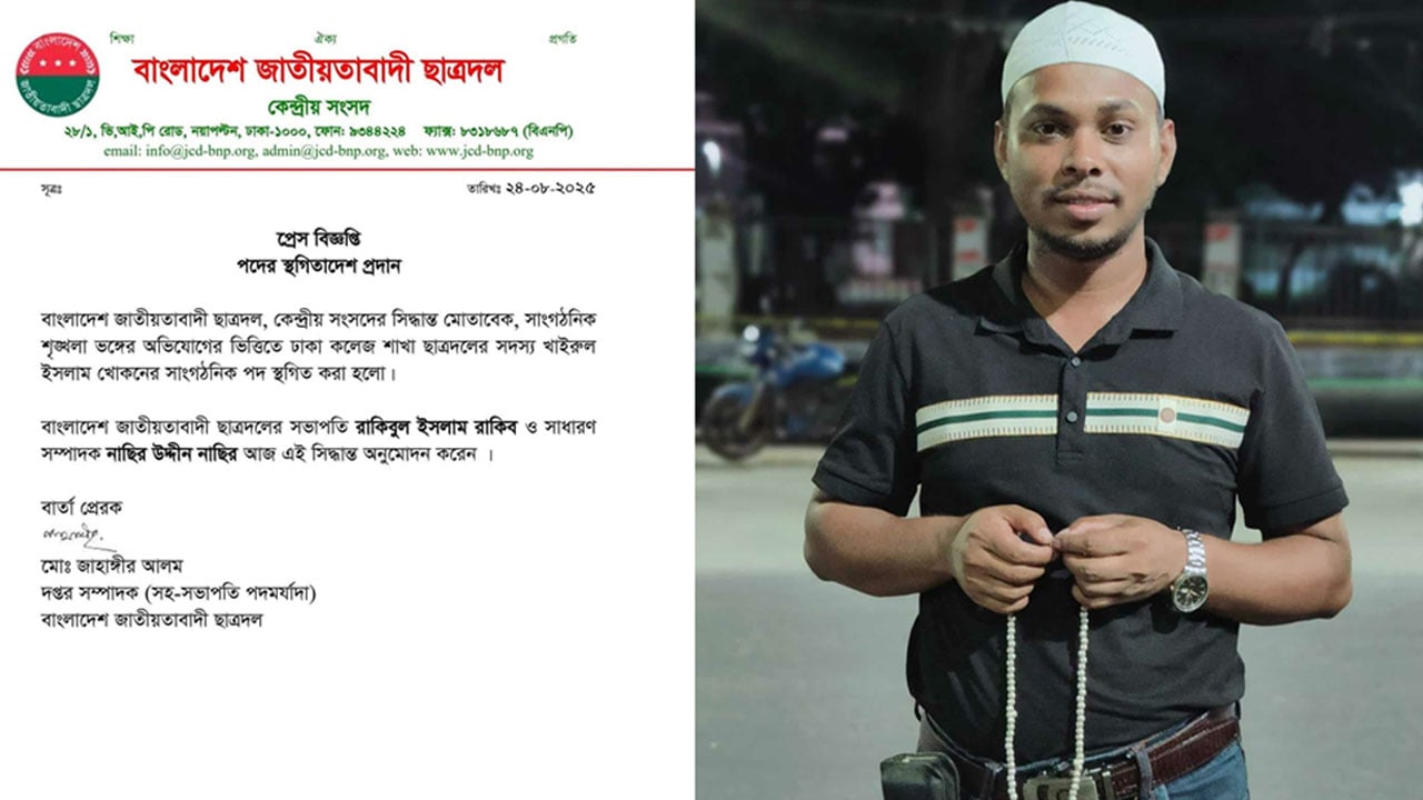 বিজ্ঞপ্তিতে বলা হয়, বাংলাদেশ জাতীয়তাবাদী ছাত্রদল, ‘কেন্দ্রীয় সংসদের সিদ্ধান্ত মোতাবেক, সাংগঠনিক শৃঙ্খলা ভঙ্গের অভিযোগের ভিত্তিতে ঢাকা কলেজ শাখা ছাত্রদলের সদস্য খাইরুল ইসলাম খোকনের সাংগঠনিক পদ স্থগিত করা হলো। বাংলাদেশ জাতীয়তাবাদী ছাত্রদলের সভাপতি রাকিবুল ইসলাম রাকিব ও সাধারণ সম্পাদক নাছির উদ্দীন নাছির এই সিদ্ধান্ত অনুমোদন করেন।
