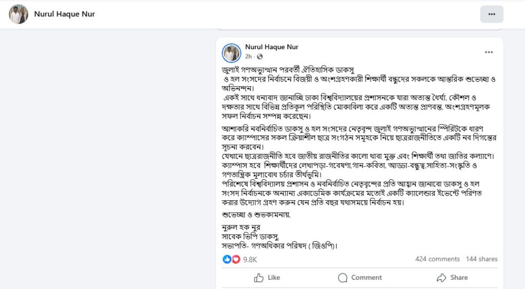 এ সময় নিজের ফেসবুক পোস্টে নুর ডাকসুতে বিজয়ীদের শুভেচ্ছা জানিয়ে বলেন, জুলাই গণঅভ্যুত্থান পরবর্তী ঐতিহাসিক ডাকসু ও হল সংসদের নির্বাচনে বিজয়ী ও অংশগ্রহণকারী শিক্ষার্থী বন্ধুদের আন্তরিক শুভেচ্ছা ও অভিনন্দন।