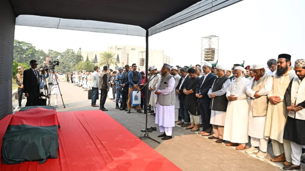 জাতীয় সংসদ ভবনের দক্ষিণ প্লাজায় ইনকিলাব মঞ্চের আহ্বায়ক শরীফ ওসমান বিন হাদির জানাজায় অংশ নিয়েছেন হাজারো মানুষ।