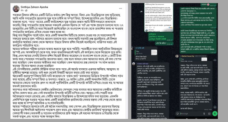 জাতীয় নাগরিক পার্টিতে যোগ দেওয়া বৈষম্যবিরোধী ছাত্র আন্দোলনের সাবেক সভাপতি রিফাত রশিদ, মুখ্য সমন্বয়ক হাসিব আল ইসলাম ও দপ্তর সম্পাদক শাহাদাত হোসেনের বিরুদ্ধে আর্থিক কেলেঙ্কারি নিয়ে আবারও মুখ খুলেছেন সংগঠনটির বিলুপ্ত কমিটির মুখপাত্র সিনথিয়া জাহীন আয়েশা। গণভোটে ‘হ্যাঁ’-র পক্ষে প্রচারণায় অজ্ঞাত উৎস থেকে আসা অর্থ নিয়ে প্রশ্ন তুললে ‘সংগঠন ভাঙার ষড়যন্ত্রে’ অভিযুক্ত করা হয় বলেও অভিযোগ করেছেন তিনি।